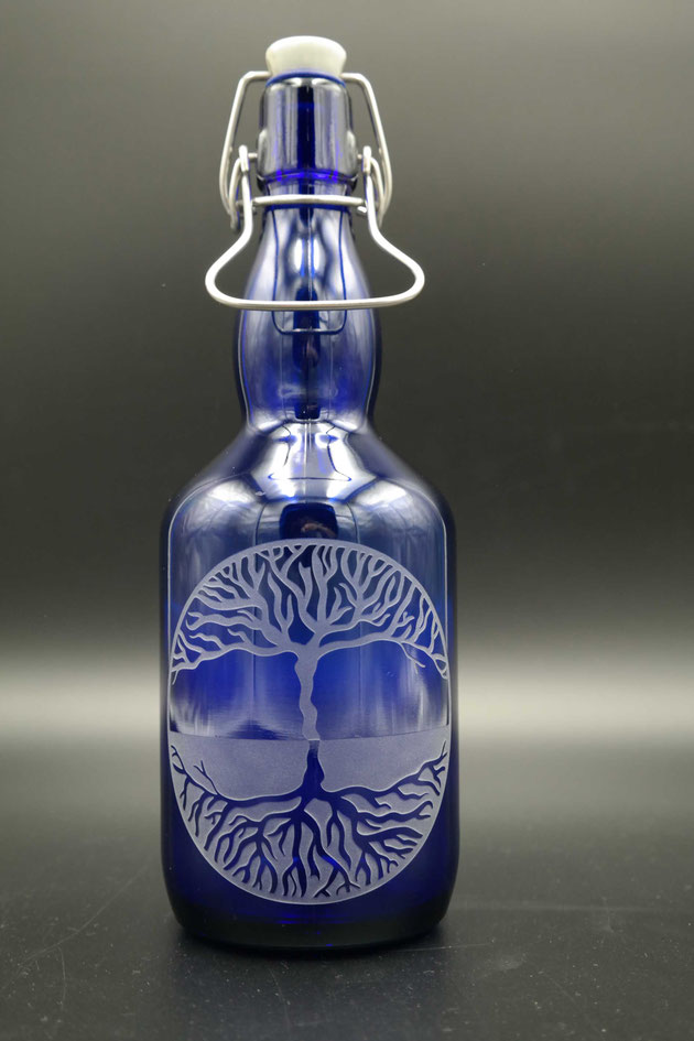 Material: blaues Glas (durchgefärbt), Gummidichtung, Keramik-Bügelverschluss mit Edelstahl Bügel und Griff.
